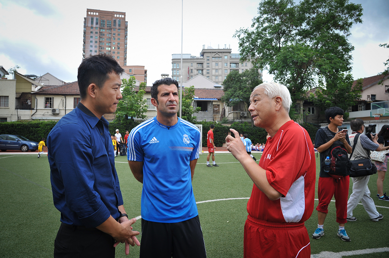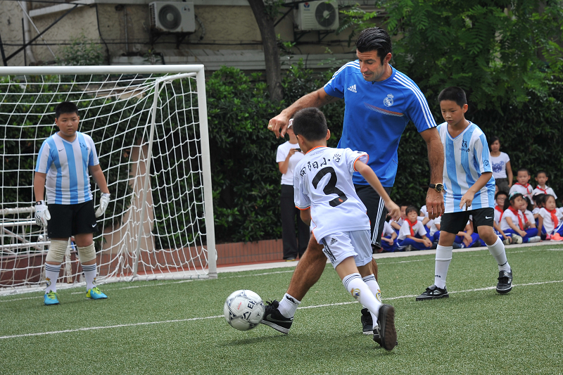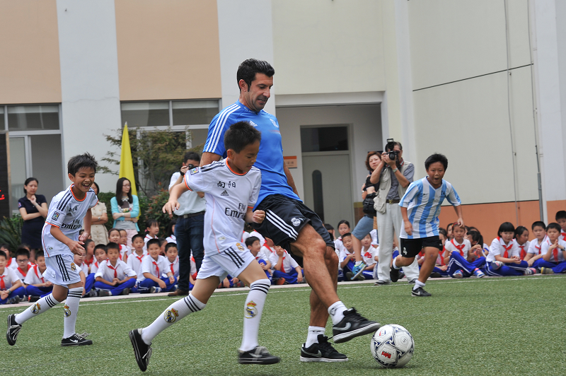 9月23日上午,向阳小学迎来了一群特殊的客人,他们是来自于西班牙皇家马德里足球俱乐部的菲戈(原世界足球先生)、帕洛尔和来自于上海老克勒明星队的著名球星朱琪、沈晗。