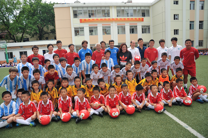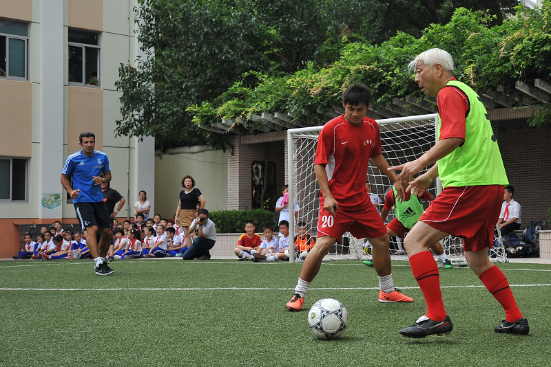 在欢迎仪式上,同学们为球星献上了鲜花,两支明星球队与校方也互相赠送了具有纪念意义的礼物。球星们身体力行,亲自为同学们做示范,传授足球技术,球星们还和小足球队员们、向阳教工足球队队员们进行了简短的热身对抗比赛,热烈的场面也迎来了观摩同学一阵高过一阵的欢呼声,活动在训练比赛的互动中达到了高潮。